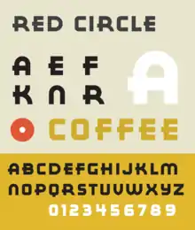 Red Circle is a geometric sans-serif typeface designed by Harold Lohner and based upon the c. 1930 lettering used in packaging and advertising for the range of A&P's Eight O'Clock, Red Circle, and Bokar brands of whole bean arabica coffees.