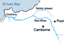 ![]() Map of the course of the Red River and the Tehidy Stream | |