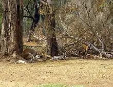 At times, red kangaroos congregate in large numbers; in areas with much forage, these groups can number as much as 1,500 individuals. Red kangaroos are mostly crepuscular and nocturnal, resting in the shade during the day.[21] However, they sometimes move about during the day. Red kangaroos rely on small saltbushes or mulga bushes for shelter in extreme heat rather than rocky outcrops or caves.[17] Grazing takes up most of their daily activities. Like most kangaroo species, they are mostly sedentary, staying within a relatively well-defined home range. However, great environmental changes can cause them to travel great distances.[17] Kangaroos in New South Wales have weekly home ranges of 258–560 ha, with the larger areas belonging to adult males.[22] When forage is poor and rainfall patchy, kangaroos will travel 25–30 km to more favourable feeding grounds.[19] Another study of kangaroos in central Australia found that most of them stay close to remaining vegetation but disperse to find fresh plants after it rains.[23] The red kangaroo is too big to be subject to significant non-human predation. They can use their robust legs and clawed feet to defend themselves from attackers with kicks and blows. However, dingoes and eagles can kill and eat joeys. Joeys are thus protected in their mother's pouch. The red kangaroo formerly did have major predators that are now extinct. Extinct predators included the marsupial lion, Megalania, and the wonambi. Kangaroos are adept swimmers, and often flee into waterways if threatened by a predator. If pursued into the water, a kangaroo may use its forepaws to hold the predator underwater so as to drown it.[24]
