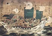 Red-seal ships (朱印船, Shuinsen) were Japanese armed merchant sailing ships bound for Southeast Asian ports with red-sealed letters patent issued by the early Tokugawa shogunate in the first half of the 17th century.[2] Between 1600 and 1635, more than 350 Japanese ships went overseas under this permit system.
