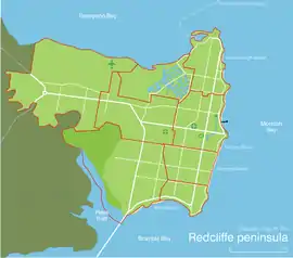 The Redcliffe Peninsula is a peninsula located in the Moreton Bay Region LGA in the northeast of the Brisbane metropolitan area in Queensland, Australia. The area covers the suburbs of Clontarf, Kippa-Ring, Margate, Newport, Redcliffe, Rothwell, Scarborough and Woody Point.