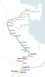 The Redcliffe Peninsula line is a 12 km stretch of heavy gauge dual-track railway between Petrie and Kippa-Ring on the Redcliffe peninsula.[2] The new line is part of Queensland Rail's City suburban network, branching from the North Coast line. It starts 200 metres north of Petrie railway station, extending from (27.5 km (17.1 mi) to 40.1 km (24.9 mi) north of Central railway station).