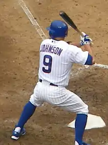 On March 25, he signed a one-year deal with the Chicago Cubs. Johnson platooned in center field with Jim Edmonds (as well as Félix Pie to start the season). Johnson "batted in" a game-winning run after he was hit by a pitch with the bases loaded on June 12, against the Atlanta Braves.[9] During a crucial game in the 2008 season against the Milwaukee Brewers, Johnson executed a perfect hard slide into second base that prevented a double play, and allowed the Cubs to take a one-run lead.[10] When Johnson returned to Rogers Centre to play the Toronto Blue Jays on June 13, 2008, he received a long standing ovation from Blue Jays fans.[11]
