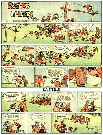 Reg'lar Fellers was a long-running newspaper comic strip adapted into a feature film, a radio series on the NBC Red Network, and two animated cartoons. Created by Gene Byrnes (1889–1974), the comic strip offered a humorous look at a gang of suburban children (who nevertheless spoke like New York street kids). Syndicated from 1917 to January 18, 1949,[3] Byrnes' strip was collected into several books. Branding also extended to such items as baseball bats and breakfast cereal.