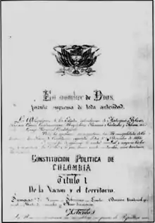 The Regeneration (Spanish: La Regeneración) was a political movement that emerged in Colombia in the late second half of the 19th century, led by Rafael Núñez. Its goal was to reverse the social and legal implications of the Radical Olympus era (Olimpo Radical) of the 1863 Constitution of Rionegro which established the United States of Colombia, made the country a federal republic and enforced the separation of church and state.[1] The motto of Regeneration was "one nation, one goal, one god" (una nación, un lema, un dios).