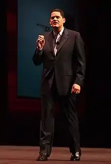 Fils-Aimé became a recognized public face for Nintendo at the 2004 E3. The year prior, Nintendo's press conference was considered a quiet and dry affair compared to the conferences given by Microsoft and Sony Computer Entertainment; while Iwata and other Japanese executives were present, the only American on stage was George Harrison and had remained stoic during the conference.[13] Nintendo was also losing in the sixth console generation. The GameCube was struggling against the PlayStation 2 and the original Xbox console, and long-time Nintendo fans were despondent over Nintendo's current state.[1] Fils-Aimé served to lead off the 2004 conference as his first introduction to the public. He led off the conference with "My name is Reggie. I'm about kickin' ass, I'm about takin' names, and we're about makin' games."[13] His presentation was considered aggressive, and at one point directly attacked the approaches that Microsoft and Sony were taking with handling of video game content on their consoles.[13] This message had been thoroughly planned by the upper management of Nintendo and Fils-Aimé had expressed caution to them about the tone of the message, but they still wanted him to deliver it.[14][15] His theatrical antics, flying in the face of Nintendo's long-standing conservative image, gained a cult following soon after, with many gamers calling him the "Regginator", a play on the character of the Terminator.[1]