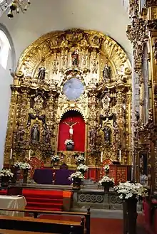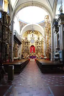 Inside, the nave runs east-west and is covered by a barrel vault.[3] The cupola area is painted with images of Church founders Augustine, Jerome, Gregory and Ambrose.[5] On the west end of the nave is the main altar. Due to its flared form, the main altar area can be described as a niche containing other niches.[5] The main altar is made of wood which has been gilded in pure Churrigueresque style.[3] The figures on the main altar include Anthony of Padua and the Four Evangelists. The smaller interior niches contain images of saints Dominic and Francis of Assisi, who is also depicted on one of the medallions. In the center, there is a canvas showing the birth of the Virgin Mary, and above this, there is a sculpture of Saint Joseph. The main altar is framed by slender inverted truncated pyramid (estipite) pilasters.[5][9] One particularly important niche is gilded, decorated with mirrors, tortoise shell and mother-of-pearl. It contains a sculpture of the Immaculate Conception dating from the 19th century. Far above the altar, there is a depiction of God the Father holding the world in his hands.[9]