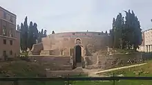 As the lands beyond the Servian Wall were traditionally not held to be part of the city of Rome, the Campus Martius also possessed several tombs, which were not permitted to be placed within the traditional limits of the city. Chief amongst these was the Mausoleum of Augustus, built to house the remains of the emperor and his family. This mausoleum also included the remains of Marcus Vipsanius Agrippa, who had already built a tomb for himself where the Piazza del Popolo now sits.[7] At the turn of the 5th century, the Regio contained 35 aediculae (shrines), 140 domūs (patrician houses), 25 horrea (warehouses), 63 balneae (bath houses) and 120 loci (fountains).[8]