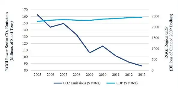 RGGI states have reduced their carbon emissions while still experiencing economic growth. Power sector carbon emissions in the RGGI states have declined by over 40% since 2005, while state economies have grown 8%.[8] Media have reported on RGGI's success as a nationally relevant example showing that economic growth can coincide with pollution reductions.[9][10][11] In a report on RGGI, the Congressional Research Service has also said that "experiences in RGGI may be instructive for policymakers seeking to craft a national program.[12]