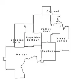 | Municipalities | Sudbury, Capreol, Nickel Centre, Onaping Falls, Rayside-Balfour, Valley East, Walden |