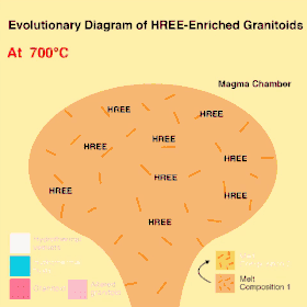 - LREE enrichment: LREE-enriched granitoids are formed by magma differentiation, which progressively fractionates magma composition into chemically-distinctive layers during its cooling process.[1] As REEs are incompatible elements (less preferred to incorporate into the structure of solidifying crystals), they remain as melt in magma chamber until the last stage of cooling. Therefore, the last and the uppermost fraction of granitoid is highly REEs-enriched.[1]