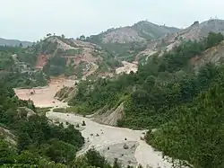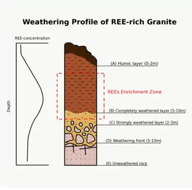 Regolith-hosted rare earth element deposits are found along ridges in low-lying granitic hills in South China.[10] The ore deposit can be profiled into four layers based on its extent of weathering while the orebody lies at lower layer of weathered soil.[11][12][13][3][14]