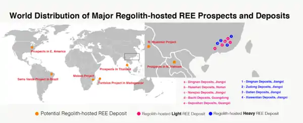 Currently, China dominates more than 95% of the global REE production.[7] Regolith-hosted rare earth element deposits, which contributes 35% of China's REE production, are mainly found in South China.[8]