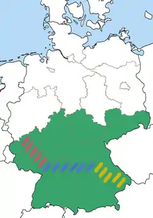 The Reihengräber culture, which developed within north-eastern Gaul under Romano-Germanic settlement during the fifth century, was located primarily between the Rhine and the Loire in the fifth century. It spread to the regions of Germanic regions of Thuringia and Bavaria in the sixth century.[5] Scholars have divided the Reihengräber culture into an eastern “Thuringian and Langobard” zone and a western “Bavarian and Alamanni” zone, based on the similar burial customs and material culture shared between these ethnic groups. Frankish populations were also present within these zones. Most Reihengräber in Germany sites are found on the River Danube or the River Main, with pockets of Frankish dominated settlements on the River Rhine. The eastern zone of the Reihengräber culture lies within the Thuringian Forest south of the Harz mountains, and extends eastward towards the River Elbe, where Slavic cultures with settled on the eastern bank. The western Bavarian zone however lies between the River Lech and River Enns. Both zones remained autonomous of Merovingian control until the mid-6th century, when Garibald I of Bavaria was installed as Duke in 555 A.D.[6]