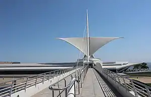 The Reiman Pedestrian Bridge is a cable-stayed footbridge in downtown Milwaukee, Wisconsin that spans Lincoln Memorial Drive. It connects the Milwaukee Art Museum on the lakeshore to the east side of the downtown's central business district by way of O'Donnell Park, a multi-use park complex. The bridge was built in 2001 as part of a major expansion to the museum that included the Quadracci Pavilion. Both the bridge and Quadracci Pavilion were designed by Santiago Calatrava, the first such structures built in the United States.