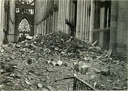 Images of the cathedral in ruins were shown during the war by the indignant French, accusing the Germans of the deliberate destruction of buildings rich in national and cultural heritage.[53] On 12 September, the German Army decided to place their wounded in the cathedral against the protests of Maurice Landrieux,[54] and spread 15,000 bales of straw on the floor of the cathedral for this purpose. That day, however, the town was evacuated of German soldiers before French General Franchet d'Esperey entered the city.[55] Six days later, a shell exploded in the bishop's palace, killing three and injuring 15.[56]