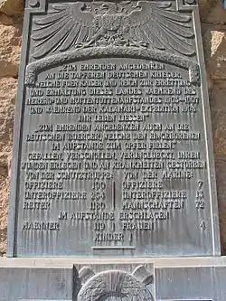 Remembering and honouring the brave German warriors that died for emperor and empire to save and protect this land during the Herero and Hottentot uprisings between 1903 and 1907, and during the Kalahari Expedition in 1908. Also remembering and honouring German citizens that died from the hands of the indigenous. Fallen, missing, died from accident, succumbed to their injuries or sickness: Of the Protection Force: 100 officers, 254 non-commissioned officers, 1180 soldiers, of the marine: 7 officers, 13 non-commissioned officers, 27 seamen. Killed during the uprising: 119 men, 4 women, 1 child.