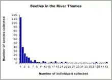 Relative species abundances follow very similar patterns over a wide range of ecological communities. When plotted as a histogram of the number of species represented by 1, 2, 3, ..., n individuals usually fit a hollow curve, such that most species are rare, (represented by a single individual in a community sample) and relatively few species are abundant (represented by a large number of individuals in a community sample)(Figure 1).[4] This pattern has been long-recognized and can be broadly summarized with the statement that "most species are rare".[5] For example, Charles Darwin noted in 1859 in The Origin of Species that "... rarity is the attribute of vast numbers of species in all classes...."[6]