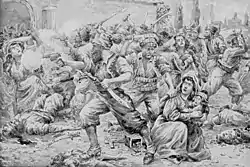 Miroslav Volf acknowledges that "many contemporaries see religion as a pernicious social ill that needs aggressive treatment rather than a medicine from which cure is expected." However, Volf contests this claim that "(the) Christian faith, as one of the major world religions, predominantly fosters violence." Instead of this negative assessment, Volf argues that Christianity "should be seen as a contributor to more peaceful social environments".[75] Volf examines the question of whether Christianity fosters violence, and has identified four main arguments that it does: that religion by its nature is violent, which occurs when people try to act as "soldiers of God"; that monotheism entails violence, because a claim of universal truth divides people into "us versus them"; that creation, as in the Book of Genesis, is an act of violence; and that the intervention of a "new creation", as in the Second Coming, generates violence.[68] Writing about the latter, Volf says: "Beginning at least with Constantine's conversion, the followers of the Crucified have perpetrated gruesome acts of violence under the sign of the cross. Over the centuries, the seasons of Lent and Holy Week were, for the Jews, times of fear and trepidation; Christians have perpetrated some of the worst pogroms as they remembered the crucifixion of Christ, for which they blamed the Jews. Muslims also associate the cross with violence; crusaders' rampages were undertaken under the sign of the cross."[76] In each case, Volf concluded that the Christian faith was misused in justifying violence. Volf argues that "thin" readings of Christianity might be used mischievously to support the use of violence. He counters, however, by asserting that "thick" readings of Christianity's core elements will not sanction human violence and would, in fact, resist it.[77]