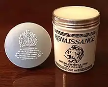 Renaissance Wax is a brand of microcrystalline wax polish used in antique restoration and museum conservation around the world. Commonly used to polish and conserve metal objects, it is also used on gemstones and such organic materials as wood, ivory, and tortoiseshell. The product is sometimes used by reenactors to protect armor and weapons. Waxes are more protective and longer-lasting than oil, especially for swords and helmets that are frequently touched by human hands.[1] It has recently been introduced in the world of guitar building, as a finish that protects and gives colour to the wood.