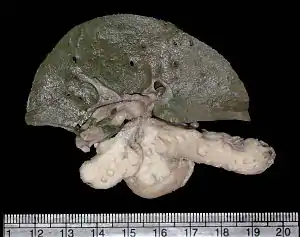 | Gross photo of liver and pancreas showing multiple cysts in the latter in a patient with renal–hepatic–pancreatic dysplasia | |