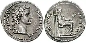 The text identifies the coin as a δηνάριον dēnarion,[1] and it is usually thought that the coin was a Roman denarius with the head of Tiberius. The coin is also called the "tribute penny." The inscription reads "Ti[berivs] Caesar Divi Avg[vsti] F[ilivs] Avgvstvs" ("Caesar Augustus Tiberius, son of the Divine Augustus"). The reverse shows a seated female, usually identified as Livia depicted as Pax.[2]
