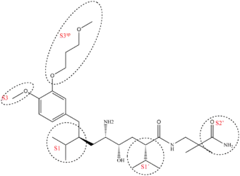 Example of binding to the renin inhibitor: Aliskiren is a peptide-like renin inhibitor and, unlike most, it is rather hydrophilic. It blocks the catalytic function of the enzyme by occupying the S3 to S2′ pockets, except the S2 pocket. Aliskiren also binds to the S3sp subpocket and because that pocket is distinct for renin, aliskiren does not inhibit other aspartic proteases, such as cathepsin D and pepsin.[46] The side chain of aliskiren binds the S3sp subpocket ideally, and leads to its quality as an inhibitor of human renin.[11] The hydroxyl group in aliskiren forms a hydrogen bond with both oxygen atoms of the Asp32. The amine group forms a hydrogen bond with the carboxylic acid group of Gly217 and the oxygen atom of the Asp32. The methoxy group on the aromatic ring fills the S3 pocket and may possibly form a hydrogen bond with a secondary amine group of Tyr14. The amide group forms a hydrogen bond with a secondary amine group of Ser76.[47] The S1 and S1′ pockets are occupied by the two propyl groups in positions P1 and P1′.[45] The terminal amide in position P2′ anchors the amide tail in the active site by forming a hydrogen bond with Arg74 in the S2′ pocket.[49]