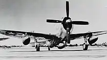 Developed in parallel with the Republic XP-69, the AP-19 was proposed by Alexander Kartveli as a replacement for the P-47.[19] The aircraft was a development of the bubbletop P-47D, but was to be powered by 3,450 hp Pratt & Whitney R-4360-13 Wasp Major 28-cylinder radial engine driving contra-rotating six-bladed Aeroproducts propellers and armed with six M2 Brownings. The USAAF ordered two prototypes on June 18, 1943. The first prototype, with a four-bladed propeller due to delayed delivery of the intended unit, was first flown on February 2, 1944, and the second prototype with the intended propeller followed on June 26 of that year. The second XP-72 crashed early in the test program, but the USAAF was impressed with its performance and placed an order for 100 production P-72 aircraft with R-4360-19 and four 37 mm cannons in place of the Brownings. However, this order was canceled as the war neared its end.[20]