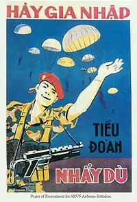 The Vietnamese Airborne Division (Binh chủng Nhảy dù Việt Nam Cộng hòa) was one of the earliest components of the Republic of Vietnam Military Forces (Vietnamese: Quân lực Việt Nam Cộng hòa – QLVNCH). The Vietnamese Airborne Division began as companies organized in 1948, prior to any agreement over armed forces in Vietnam. After the partition of Vietnam, it became a part of the Army of the Republic of Vietnam. This division had its distinct origins in French-trained paratrooper battalions, with predecessor battalions participating in major battles including Dien Bien Phu and retained distinct uniforms and regalia.[1] With the formation of an independent republic, the colonial paratroopers were dissolved, however regalia and aesthetics alongside the nickname "Bawouans" would be retained.