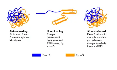 Resilin is a disordered protein; however its segments may take on secondary structures under different conditions. It is discovered that peptide sequence encoded by exon 1 exhibit an unstructured form and cannot be crystallized, which allows the peptide sequence segment to be very soft and highly flexible. Exon 3 encoded peptide takes on the unstructured form before loading, but transforms to an ordered beta-turn structure once stress is applied. Meanwhile, segment encoded by exon 2 serves as a chitin binding domain.[4] It is proposed that as stress is applied, or there is energy input, exon 1 encoded peptide responds immediately due to its high flexibility. Once this occurs, the energy is passed onto exon 3 encoded peptide, which transforms from the unstructured form to beta-turn structure to store energy. Once the stress or energy is removed, exon 3 encoded segment reverses the structural transformation and outputs the energy to exon 1 encoded segment.[4]