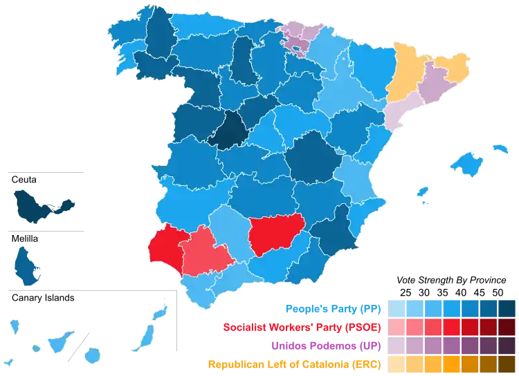 | Constituency | PP | PSOE | UP | C's | ERC | CDC | PNV | EH Bildu | CCa–PNC | |||||||||