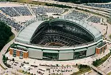 Architecturally speaking, retractable roofs vary greatly from stadium to stadium in shape, material and movement. For example, Miller Park[4] has a fan style roof, while Toyota Stadium in Japan has an accordion-like roof. Most retractable roofs are made of metal, while some, such as the roof of State Farm Stadium, are made of water-resistant fabric. Although each retractable roof differs in these aspects, the roof of T-Mobile Park[5] is unique in that it is the only one in North America that does not form a climate-controlled enclosure when in the extended position; rather, it acts as an "umbrella" to cover the playing field and spectator areas during inclement weather, with no side walls enclosing the stadium.