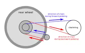 In the single-chain system, the chain runs from the top of a chainring attached to the cranks to the top of a sprocket attached to the rear wheel hub with a freewheel, as with most bicycle chain drives. The chain then, usually, wraps around the rear sprocket to an idler sprocket between the rear wheel and the cranks, then runs back to a second sprocket attached to the rear wheel with a second freewheel, and finally returns to the bottom of the chain ring. Other configurations are possible, including one chain for forward pedalling, and a second crossed-chain configuration for reverse pedalling. Only one freewheel is engaged at a time, while the other spins backward freely. Since the chain wraps around the second sprocket in the opposite direction to the first sprocket, the cyclist needs only to pedal backwards to engage it. The small amount of out-of-line required of the chain is easily accommodated. The rear wheel cannot rotate backwards because the two freewheels try to drive the pedals forward and backward at the same time.