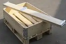 ![]() A steel cage used as reusable packaging | ![]() A wooden pallet collar box | ![]() A Corrugated plastic box used as reusable packing | ![]() Corrugated plastic dividers used to pack automotive components. |