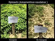 The NGO SOIL in Haiti began building urine-diverting dry toilets and composting the waste produced for agricultural use in 2006.[54] SOIL's two composting waste treatment facilities currently transform over 20,000 gallons (75,708 liters) of human excreta into organic, agricultural-grade compost every month.[55] The compost produced at these facilities is sold to farmers, organizations, businesses, and institutions around the country to help finance SOIL's waste treatment operations.[56] Crops grown with this soil amendment include spinach, peppers, sorghum, maize, and more. Each batch of compost produced is tested for the indicator organism E. coli to ensure that complete pathogen kill has taken place during the thermophilic composting process.[57]