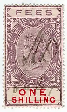 Dual-purpose postage and revenue stamps of the Leeward Islands were also valid for fiscal use on the islands from 1890 to the 1950s.[2]