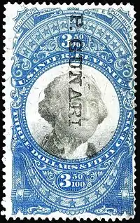 In the continuation of providing funding for the Spanish–American War Congress authorized a tax on a wide range of goods and services including various alcohol and tobacco products, tea and other amusements and also on various legal and business transactions (such as Stock certificates, bills of lading, manifests, and marine insurance). To pay these tax duties revenue tax stamps were purchased and affixed to the taxable item or respective certificate.[25][26] There are seventeen stamps in this issue which occur in denominations ranging from ½-cent to 50-dollars which were printed on double lined watermarked paper. Two types of perforations were used: Rouletted perforations and 'hyphen' shaped perforations. Numerous double transfers occur (doubled image) in this issue.[27]