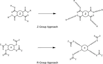 Using a compound with multiple dithio moieties (often termed a multifunctional RAFT agent) can result in the formation of star, brush and comb polymers. Taking star polymers as an example, RAFT differs from other forms of living radical polymerization techniques in that either the R- or Z-group may form the core of the star (See Figure 7). While utilizing the R-group as the core results in similar structures found using ATRP or NMP, the ability to use the Z-group as the core makes RAFT unique. When the Z-group is used, the reactive polymeric arms are detached from the star's core during growth and to undergo chain transfer, must once again react at the core.[14]