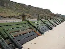 Dynamic revetments use gravel or cobble-sized rocks to mimic a natural cobble beach for the purpose of reducing wave energy and stopping or slowing coastal erosion.[5] Unlike solid structures, dynamic revetments are designed to allow wave action to rearrange the stones into an equilibrium profile, disrupting wave action and dissipating wave energy as the cobbles move. This can reduce the wave reflection which often contributes to beach scouring.[6][7]
