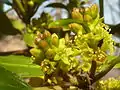 The small fragrant flowers are gathered in a short axillary yellow-green raceme. The flowering period extends from February to April. Fruits are obovoidal red-brownish drupes of about 3–4 millimetres (0.12–0.16 in),[1] containing from 2 to 4 seeds. The drupes darken to black when ripe. Fruits have medicinal properties and can be used with caution as a laxative.