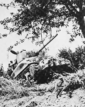 Prior to the launch of Operation Cobra (an American offensive during the Normandy campaign), solutions were developed for how tanks could effectively support the offensive within this terrain.[9] Bulldozers or tanks modified to carry a bulldozer blade were used to open gaps in hedgerows. Some hedgerows were so thick that engineers first had to blow a hole in the bank, which a bulldozer would later clear and widen. This time-consuming process slowed down the progress of the Allied offensive, and was compounded by the problem of the conspicuous bulldozers and dozer tanks being targeted by German gunners to deny the Allies a means to break through.[10] Throughout July "innumerable" inventions were created by various American units to get tanks through the hedges quickly without exposing their weak underside armor. A hedgecutter developed by the 79th Infantry Division was in operation by 5 July, and a few days later, XIX Corps demonstrated a set of prongs that had been initially developed to create holes for the placement of explosives. The force of these prongs were able to lift and remove a portion of the hedgerow, enough so that the tank would be able to push on through to the other side. Units within V Corps also invented devices, which were dubbed 'brush cutters' and 'greendozers'.[11]