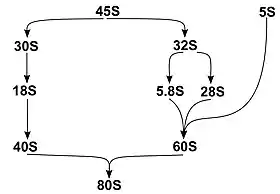 | eukaryotic | 80S | 60S (5S : 121 nt,[19] 5.8S : 156 nt,[20] 28S : 5070 nt[21]) | 40S (18S : 1869 nt[22]) |