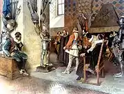 The collection of armory, specialized in melee weapons, is among the largest of its kind in the world.[9] It comprises nearly 3,000 objects, the majority of which produced in England, France, Italy, Germany, Spain, Sweden, Turkey, India and Japan. The collection includes weapons used for hunting, battling (offensive and defensive), exhibition and decoration. One of the highlights is the set of 27 full plate armors (i.e., including shields, helmets, gauntlets and chain mails) produced between the 14th and the 17th centuries, as well as armors for dogs and horses.[1][11]