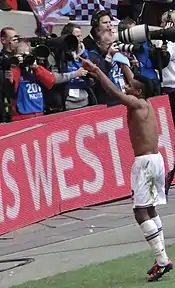 Vaz Tê signed for then Championship club West Ham United on 31 January 2012, for an undisclosed fee on a 2 1⁄2-year deal with an option for a third year.[18] Vaz Tê made his debut for the club, coming on as an 89th-minute substitute for Carlton Cole in the London derby against Millwall on 4 February. The game finished 2–1 to West Ham United.[19] On 21 February 2012, Vaz Tê scored his first goal for the Hammers, in a 4–1 victory at Blackpool.[20] Nicky Maynard and Gary O'Neil also scored their first professional goals for the club.[20] Vaz Tê scored his first hat-trick for West Ham on 14 April 2012, in West Ham United's 6–0 home victory against Brighton & Hove Albion.[21] West Ham finished 3rd behind Southampton entering the play-offs against Cardiff City. They won the first leg at the Cardiff City Stadium 2–0 and the second leg 3–0 at the Upton Park, with Vaz Tê scoring the second goal of the second game. West Ham progressed to the play-off final with a 5–0 aggregate victory. In the play-off final at Wembley on 19 May 2012, Vaz Tê scored the winning goal in the 87th minute.[22] It was the 24th goal Vaz Tê had scored in the 2011–12 season.[3]