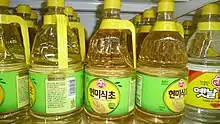 In Korean cuisine, ssal-sikcho (쌀식초; "rice vinegar") made with either white or brown rice. Glutinous rice may also be used. Rice is mixed with nuruk (fermentation starter).[8] Alternatively, rice wine lees can be used to make rice vinegar, in which case the final product is often called makgeolli-sikcho (rice wine vinegar). Two rice vinegar varieties, each from North Gyeongsang Province and South Chungcheong Province, are included in the Ark of Taste catalogue of heritage foods.[9][10]