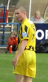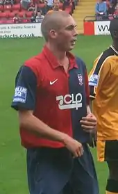 Brodie scored the winning goal for York in a 2–1 away victory over Oxford United in the FA Trophy second round, ensuring their progression to the third round.[46] He scored York's first goal in a 2–1 home win over AFC Telford United in the FA Trophy semi-final second leg, with the tie being won 4–1 on aggregate, which saw the team reach the final at Wembley Stadium.[67] A yellow card picked up against Kidderminster Harriers on 28 March 2009 resulted in Brodie receiving a two-match suspension, meaning he would miss matches against Grays and Oxford, after being booked on 10 occasions during the season.[68] He returned to the team for a 2–1 home defeat to Northwich on 11 April 2009, and during this match he was fouled in the penalty area, with the penalty kick being scored by Mark Robinson.[69] Brodie scored against Weymouth in a 2–1 away victory on 24 April 2009, which ensured York's survival in the Conference Premier.[70] They finished the season 17th in the table.[71] Brodie started in the 2009 FA Trophy Final at Wembley Stadium on 9 May 2009, which York lost 2–0 to Stevenage Borough.[72] He finished the season as York's top scorer with 19 goals in 46 appearances,[46] and in May 2009 the club exercised its option to extend his contract for 2009–10.[73]