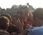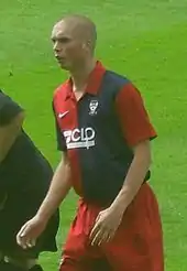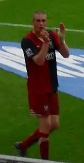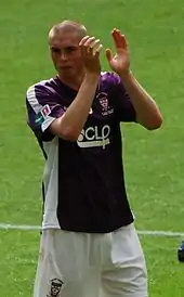 Brodie was named as York's Players' Player of the Year for the season, as well as being awarded the Keith Walwyn Golden Boot, having scored 32 goals at that point.[99] York finished fifth in the Conference Premier,[100] and Brodie was the division's joint top scorer alongside Matt Tubbs with 26 goals.[76][101] He scored the winning goal on 89 minutes to give York a 1–0 home victory against Luton in the play-off semi-final first leg.[102] He played in the 1–0 away victory in the second leg, meaning York won the tie 2–0 on aggregate.[103] After the match, Brodie was hit by a coin, with the squad being forced into the back of a stand after missiles were thrown at them by a section of Luton fans.[104] He started in the 2010 Conference Premier play-off Final at Wembley Stadium on 16 May 2010, in which York lost 3–1 to Oxford.[105] He finished 2009–10 with 51 appearances and 34 goals,[76] making him York's highest goalscorer in a season since Bottom scored 39 in 1954–55.[106] York entered negotiations over a new contract with Brodie after the end of the season.[107] At the Football Conference's Annual Presentation Dinner, he was named the Conference Premier Player of the Year and a member of the Team of the Year.[108]