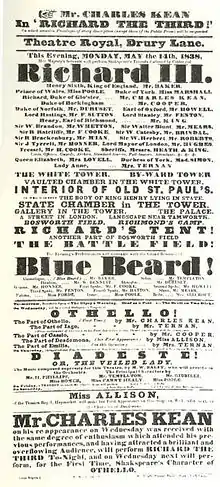 Edmund Kean (1787–1833) was also celebrated for the role of Richard III. A frenetic and lively manner characterised Kean's style of performance, but his tendency to drink too much before coming to work caused rumour and criticism. Nevertheless, the audience adored him for creating entertaining theatre. He mostly played villains such as Richard III. Moreover, Kean performed this role outside Britain. On 29 November 1820 he played Richard III in New York.[12]