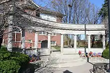 The Richmond Hill Dynes Jewellers softball team was the 1972 Softball World Champions.[7] The Royal Canadian Air Farce was recorded at the Curtain Club Theater in Richmond Hill for its first 5 seasons on radio, beginning in 1973.[8] The Air Farce returned for an anniversary recording in the 1990s. Also in 1973 was the centennial of the town's incorporation as a village, and the town set up a number of celebratory activities, including a beard growing contest, commissioning a centennial song, a parade, a street dance and the unveiling of a historic plaque honoring the town's founding in front of the municipal offices. June 27 was officially declared Russell Lynett Day, named after the town's clerk, only the third in its existence. 1973 also saw the sale of the last of the original rose-growing greenhouses in Richmond Hill. Development had led to increasing property taxes and the H.J. Mills greenhouses relocated to Bayview Avenue and Elgin Mill Road. The site of the greenhouses was developed as a subdivision. The fast-growing town set aside significant areas for parks, with five new parks dedicated in 1973, and two more in 1974. The Richmond Hill Historical Society was founded in 1973.[7] The society was dedicated to preserving the history of Richmond Hill and raising awareness of the town's history. Their first action was to restore a 150-year-old house, known as the Burr House.