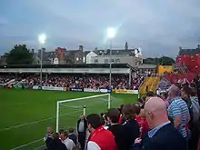 The main stand seats 1,800 people. Behind one goal, at the Inchicore end, the space was constructed into a new uncovered stand in time for the 2007 UEFA Cup campaign of St Patrick's Athletic F.C. This stand seats 1,000 and is known as the West (or 'New') Stand. The hardcore St. Pat's supporters have traditionally gathered at the other end, in the 'Shed End', though in more recent times the Shed has housed the away supporters while the more vocal Pat's fans have moved to the main stand. Although known locally as the "Shed End" the official name is the John Minnock stand, as it was financed with money received from his transfer to Charlton Athletic. It was originally a fully covered terrace, before half the roof was removed in the early 2000s and the other half in early 2020, leaving it as an uncovered terrace.[5][6] The camac terrace, across from the main stand, is used by home fans, and named after the river that runs behind it. The Camac holds the ground's TV gantry.